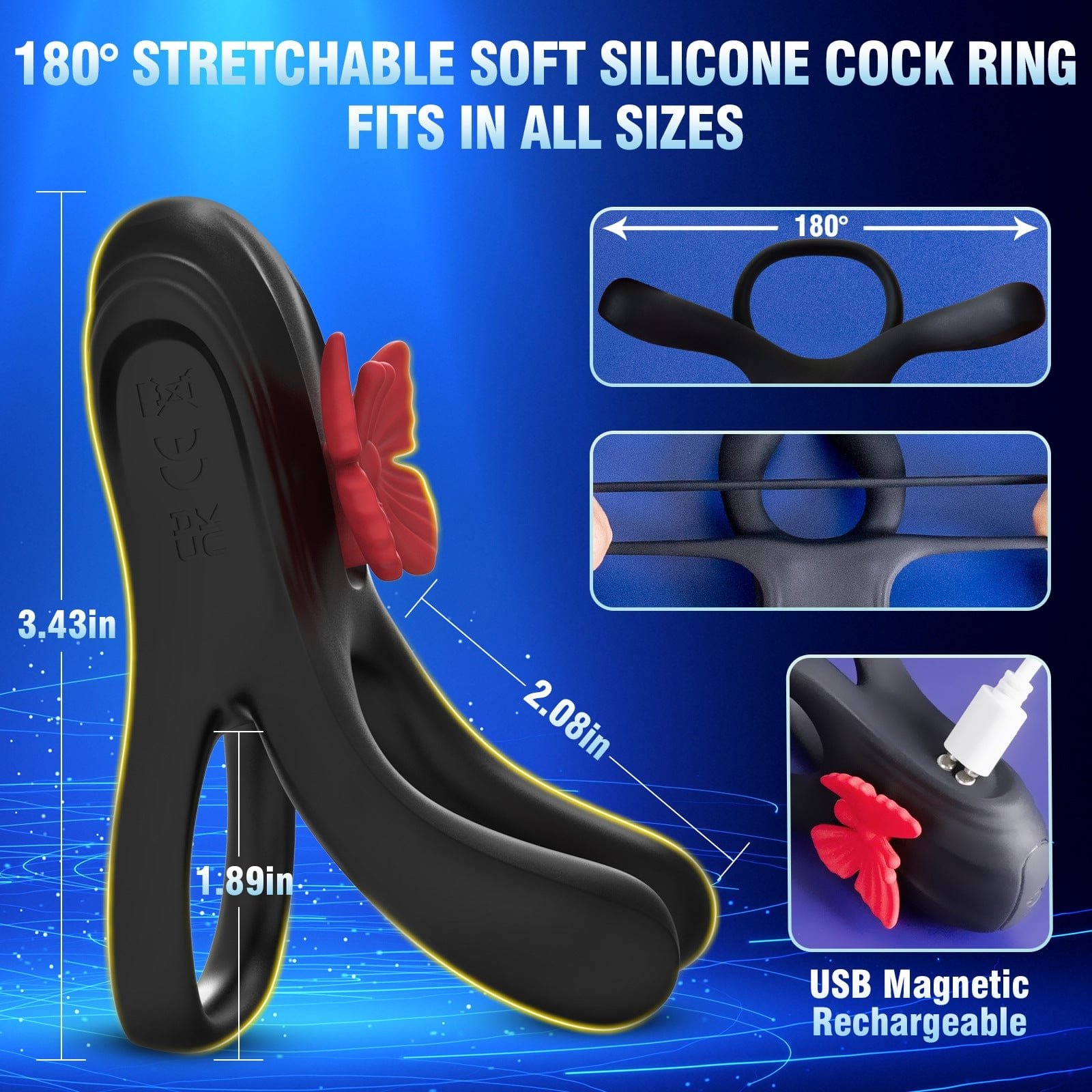 Function: 3 – motor 10 – vibration mode for testicle, penis and female C – spot stimulation, adjustable ring for enhancing erection, high – elastic and flexible design, magnetic – suction USB charging, IPX7 waterproof