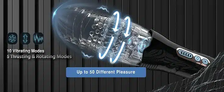 - Powerful 10 Vibrating Modes – The vibrator of this automatic male masturbator is built into the silicone sleeve for maximum. most exciting pleasure. Up to 10 different frequency vibration modes. with 5 thrusting and rotation modes. you are completely free to play and get 50 different stimulation experiences from the sex toys. it’s intoxicating and stimulatin